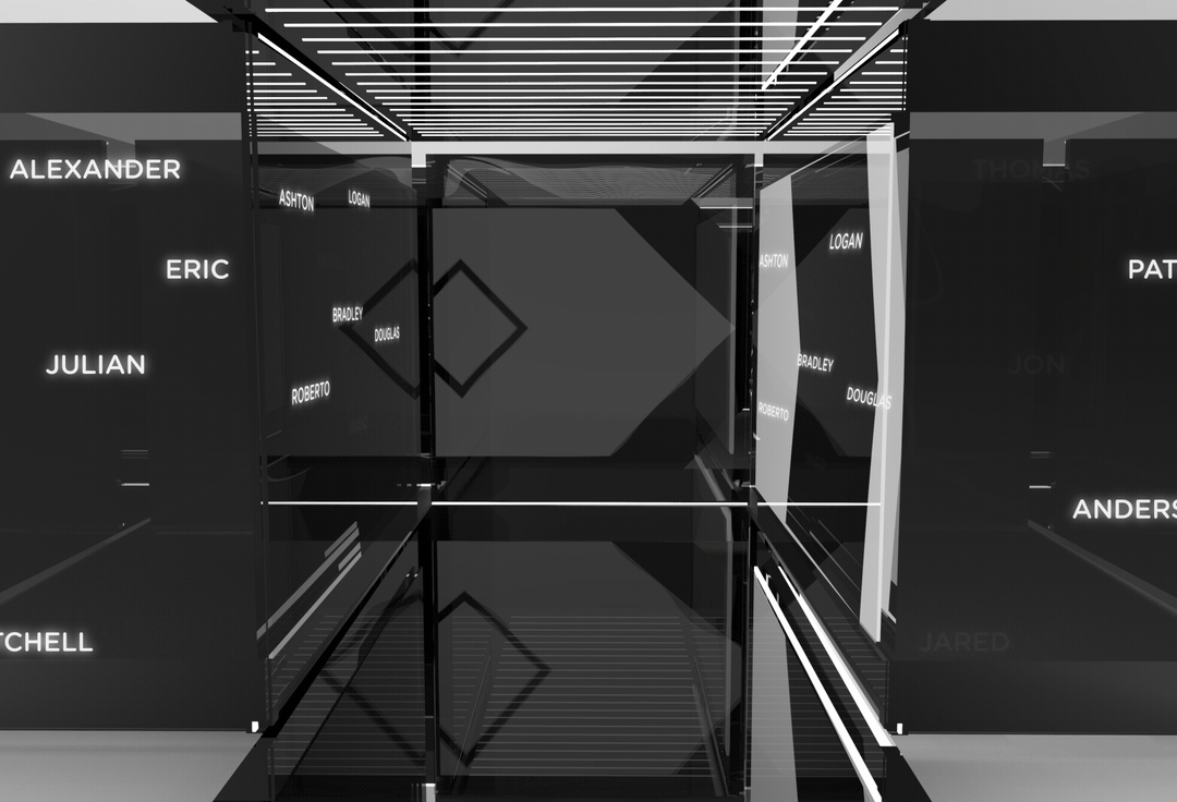 GUESTS WALK IN THROUGH A TUNNEL OF THE BOYS’ NAMES AND INTO THE FIRST ROOM. THERE, IN THE CENTER, IS A LARGE TF SCULPTURE SURROUNDED BY FREE FLOATING SCREENS THAT WRAP GUESTS IN THE PLAYFUL CONTENT.